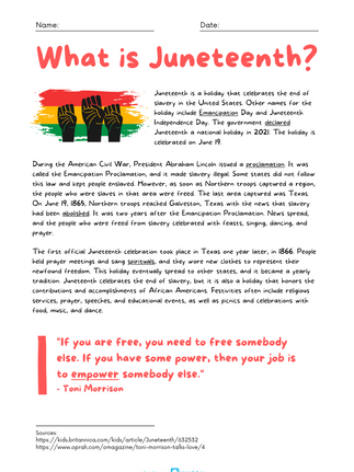 June 19th, or "Juneteenth," commemorates the day in 1865 when news reached Galveston, Texas that all enslaved people were free (over two years after slavery had already been abolished). In 2021, Juneteenth National Independence Day was declared a federal holiday! We've created an activity packet and put together some great resources for kids, parents, and educators looking to learn more about this holiday's important history. Scroll to the bottom for the printable worksheet.